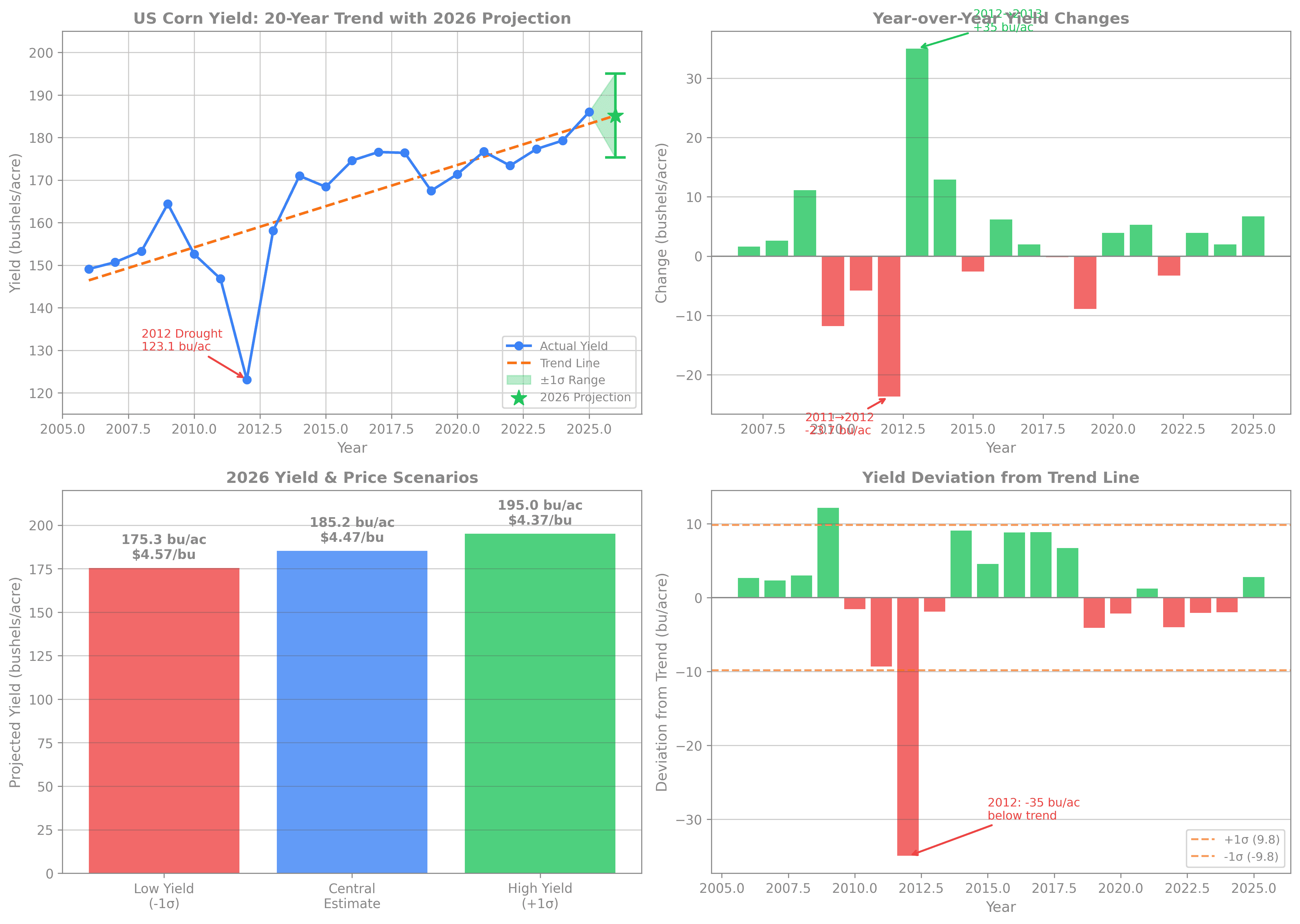 Based on 20 years of USDA NASS corn yield data (2006-2025), I've developed a comprehensive projection for 2026 corn yields with associated price implications. This analysis includes enhanced visualizations to better illustrate trends, volatility, and projections.