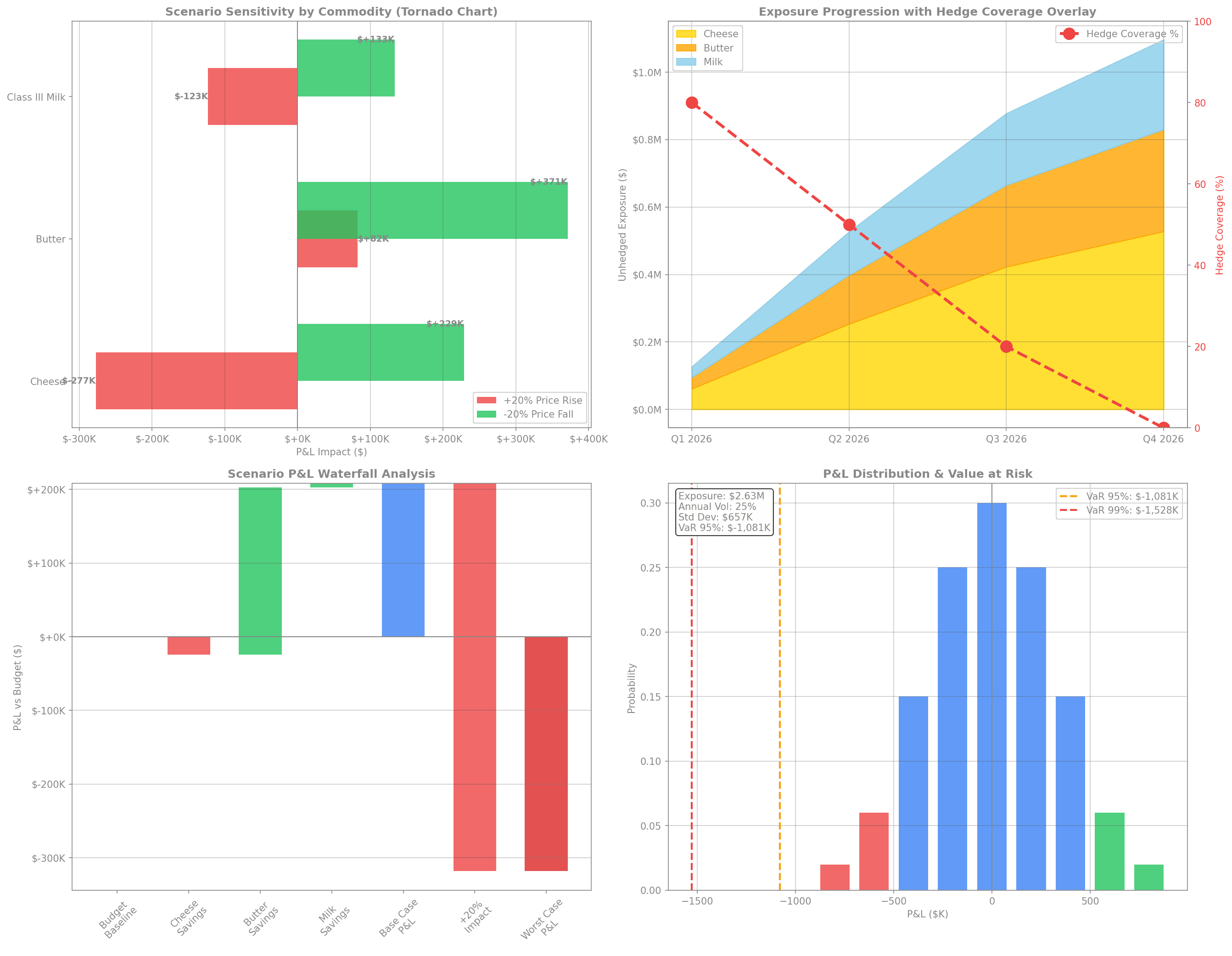Top Left: Tornado chart showing sensitivity by commodity - butter provides largest favorable variance, cheese has highest downside risk
