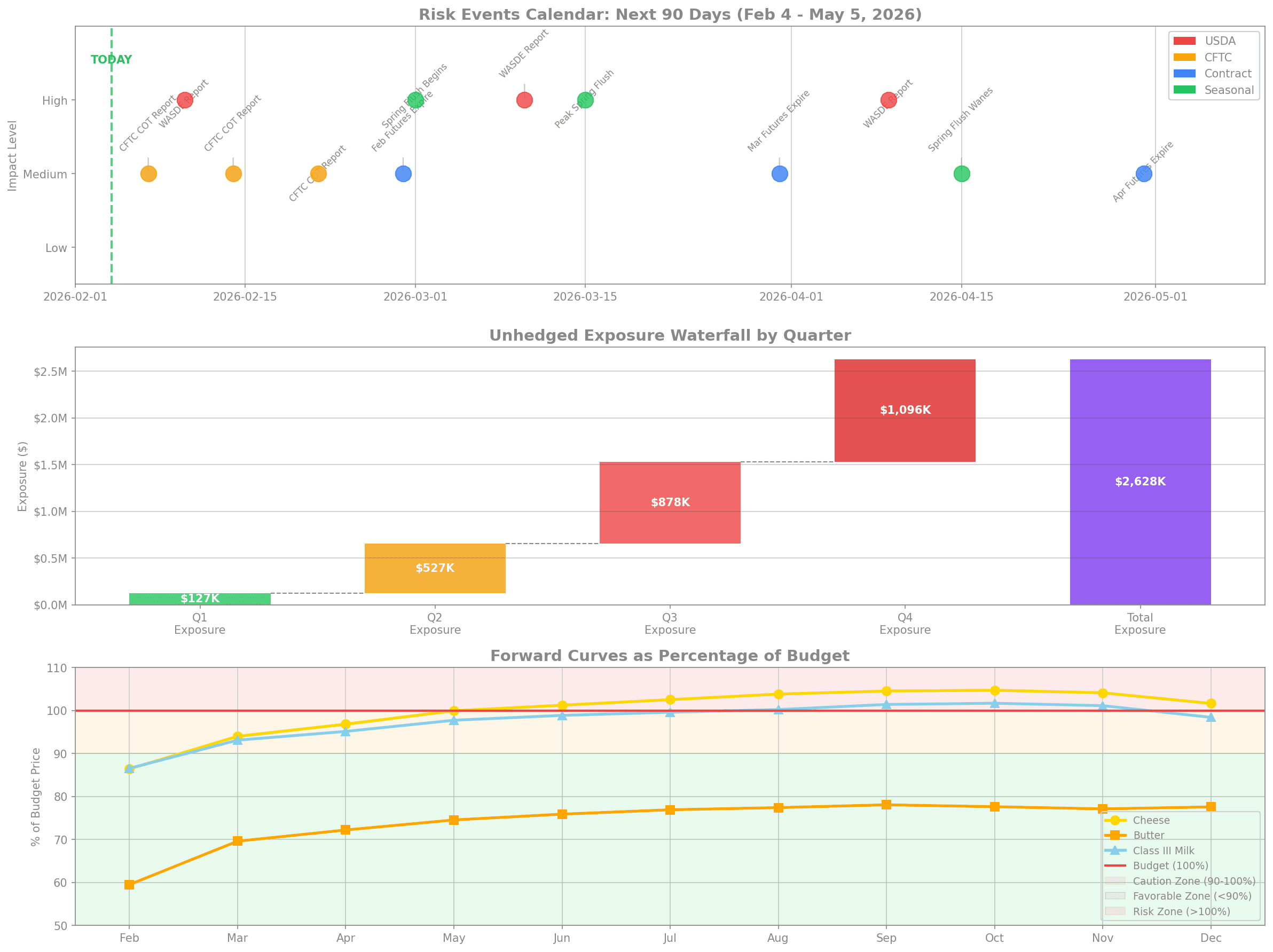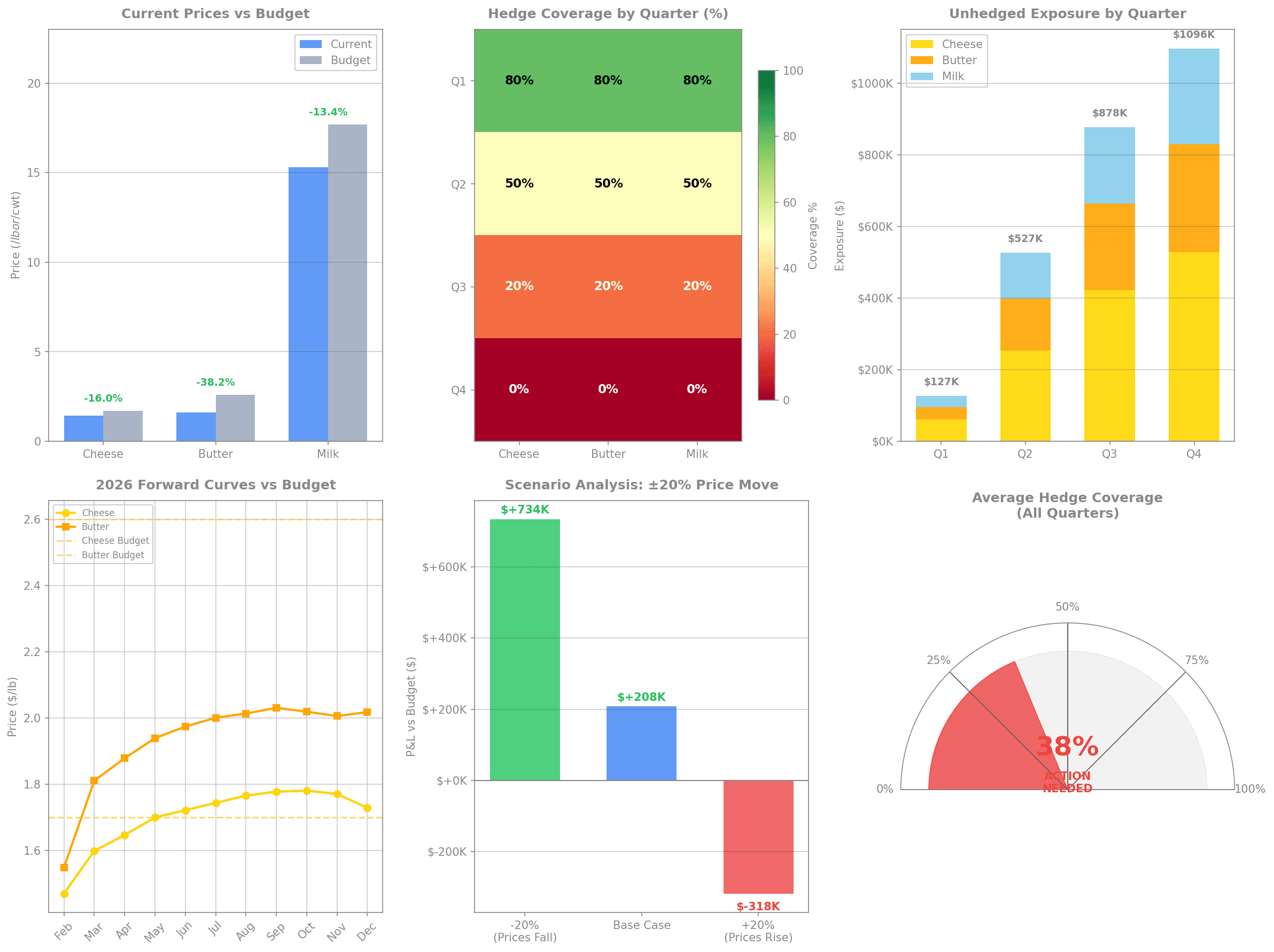 This 6-panel dashboard provides a comprehensive view of your dairy risk position: