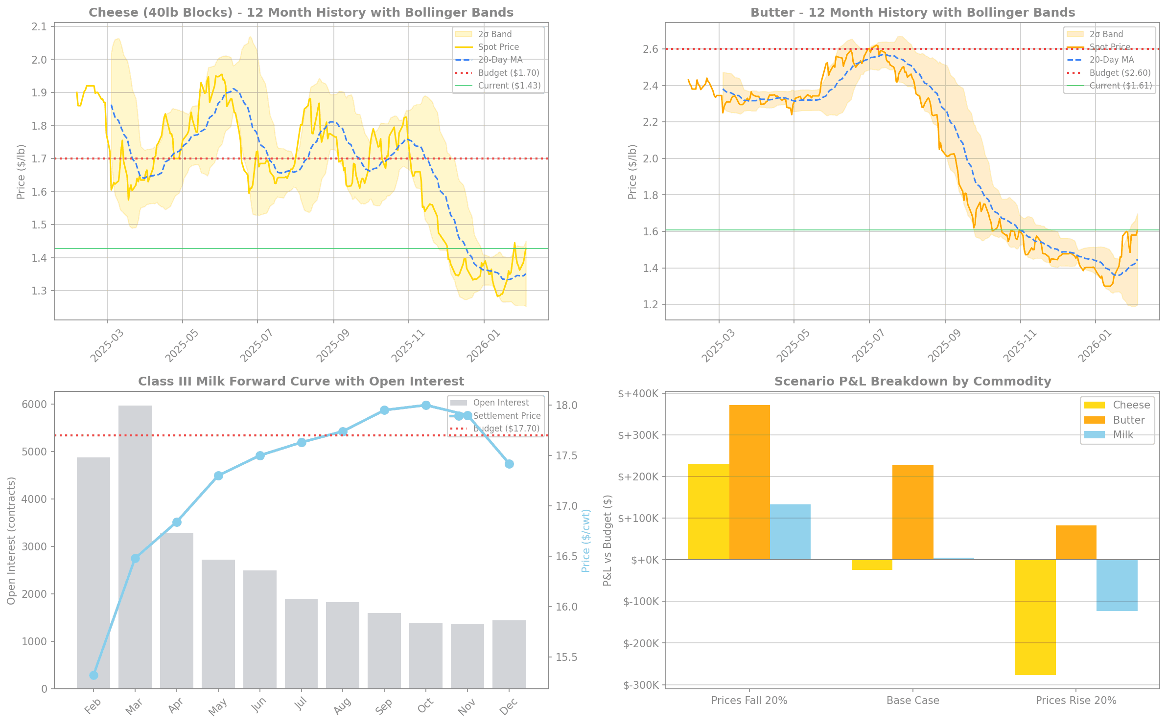 Bottom Right: Scenario P&L breakdown by commodity showing butter provides the largest favorable variance
