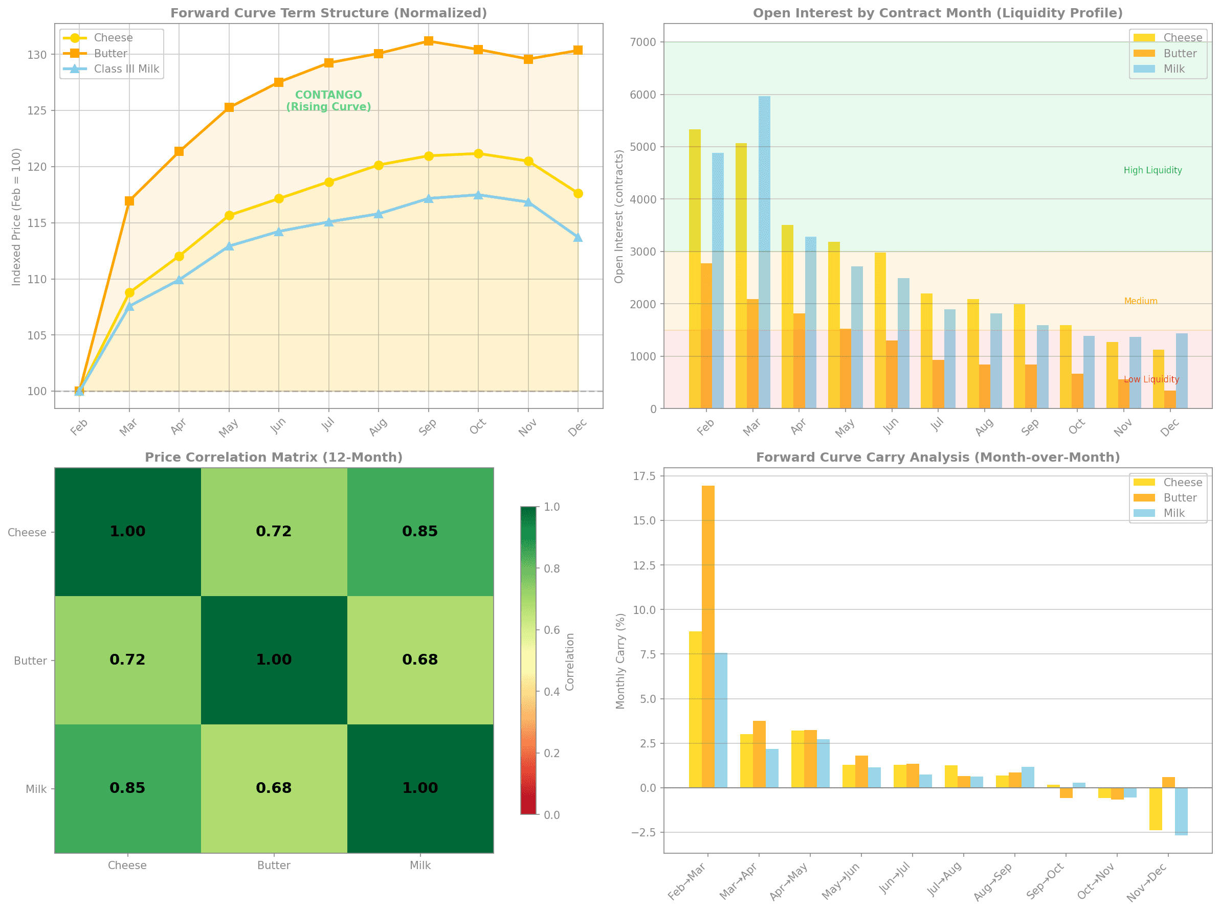 Bottom Left: Class III Milk forward curve with open interest overlay showing liquidity concentration in near months